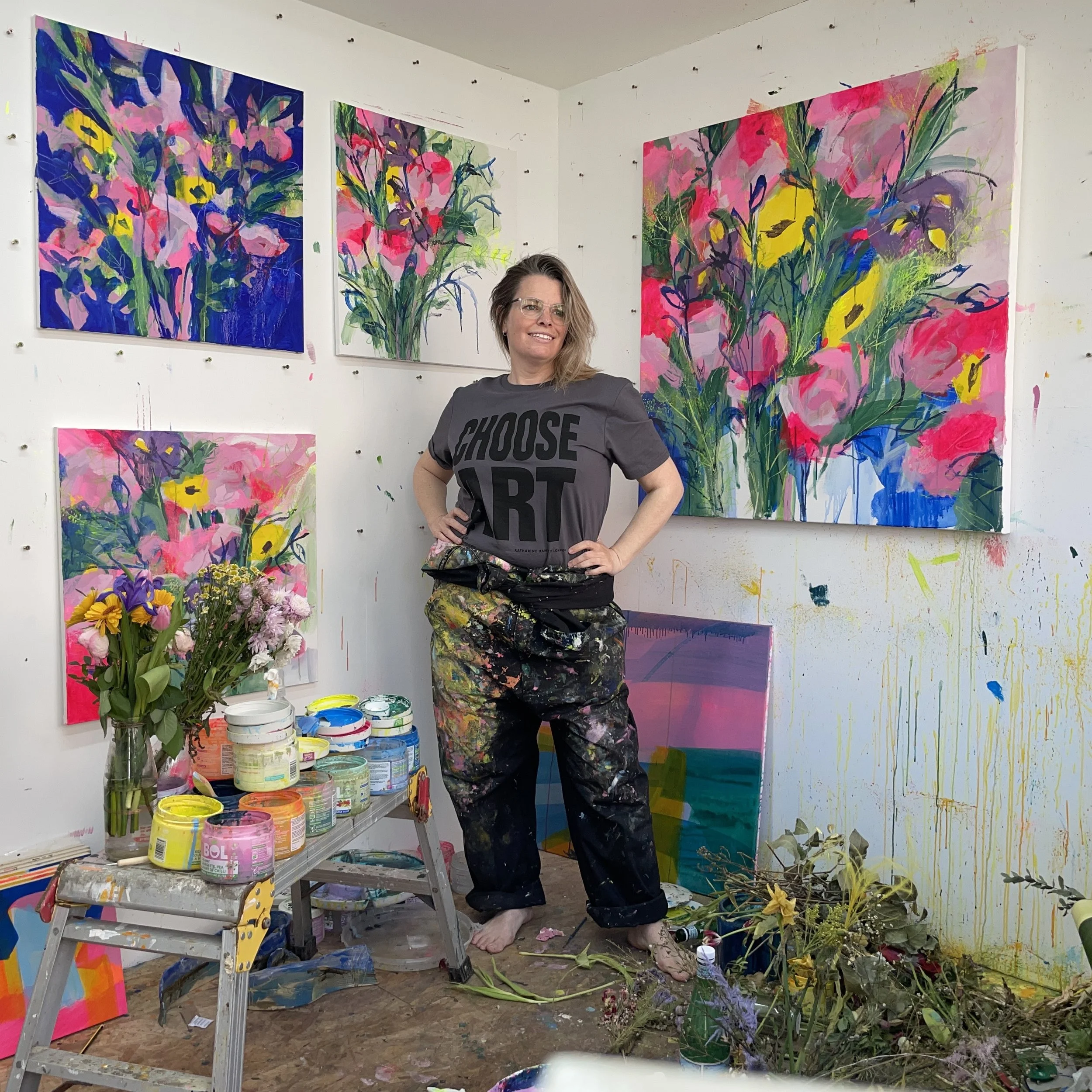 Faye’s studio is a shed at the end of her garden, a charming, cluttered haven brimming with creativity. Its paint-splattered walls and floor are a testament to the joy and excitement she pours into every brushstroke, making it a space where ideas come to life with boundless energy.